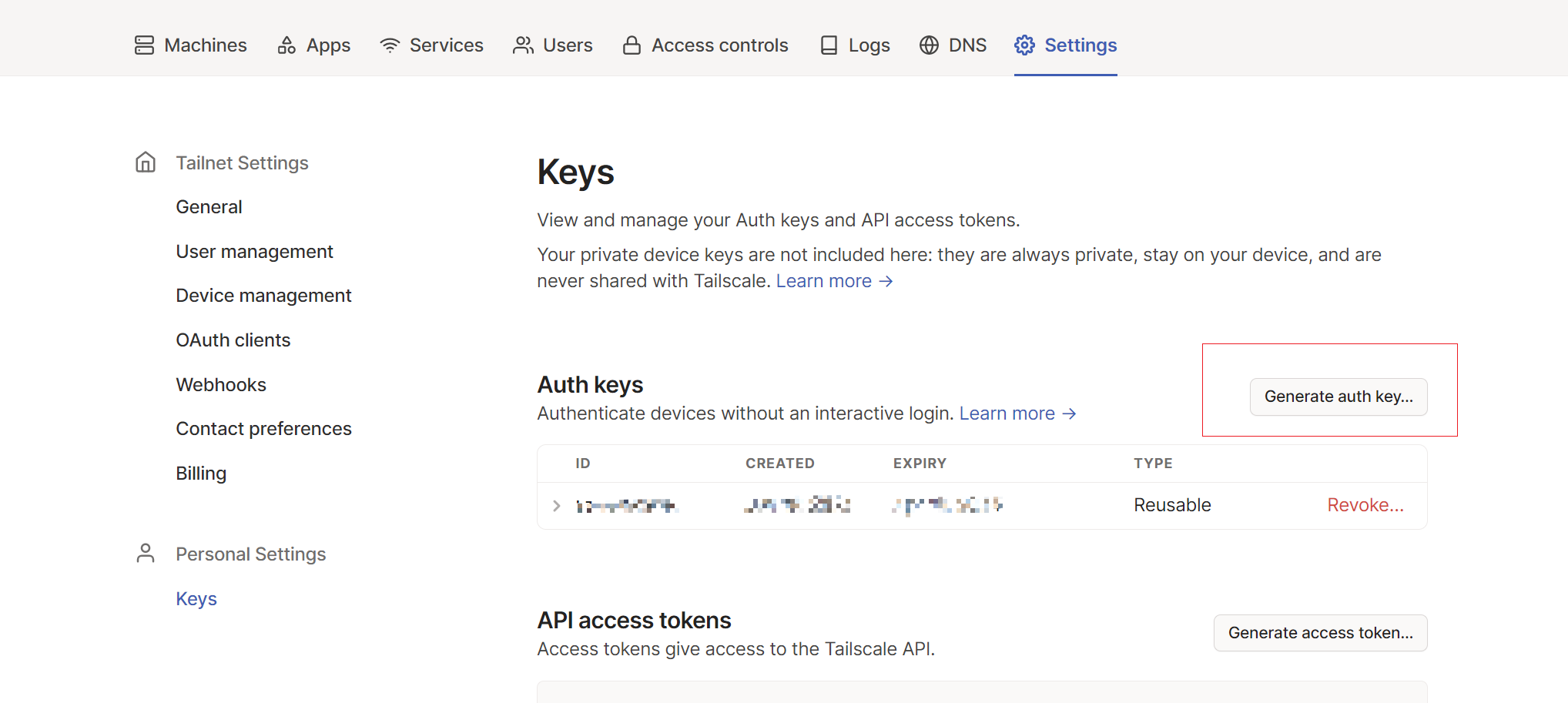 tailscale up --authkey=xxxxx --accept-routes --advertise-routes=10.0.0.0/24上一步使用的authKey是在tailscale的web管理端生成的,具体位置见下图: