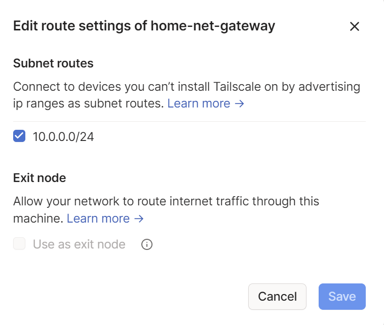 Edit route setting, 在弹出框中将subnet routes勾选上,并保存, 至此, 当其他设备连接上tailscale之后,就可以直接通过10.0.0.X的IP直接访问和lxc容器属于同一网段的其他设备。